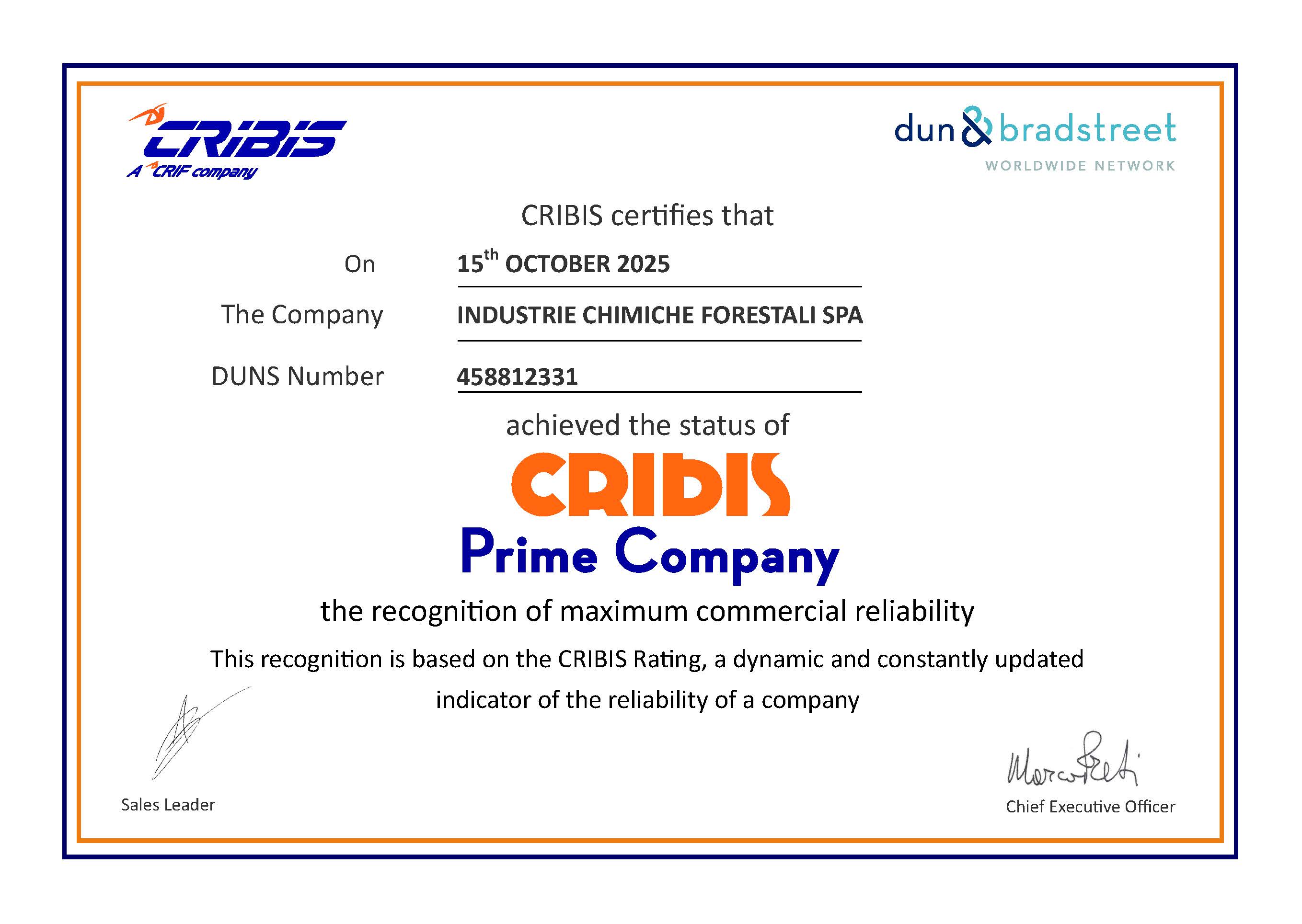 CRIBIS, società specializzata nella fornitura di business information su imprese italiane ed estere, ha assegnato a Industrie Chimiche Forestali S.p.A. il riconoscimento CRIBIS Prime Company, attribuendole il massimo livello di affidabilità come controparte di una transazione commerciale BtoB.
